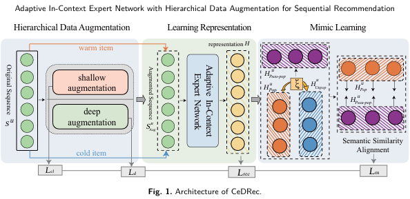 此研究工作提出了一种新的多任务序列推荐框架——自适应上下文专家网络序列推荐。旨在解决现有推荐系统在数据稀疏、交互噪声及冷启动等复杂场景下的性能瓶颈。该模型通过层次化数据增强在浅层与潜在空间同时生成多样化序列视图,有效缓解数据稀疏和噪声干扰;引入自适应上下文专家网络,实现对用户行为中关键特征的动态捕捉;并结合模仿学习,利用热门物品信息提升冷门物品的表示能力,从而缓解推荐中的长尾问题。实验结果显示,该方法在命中率(HR)和归一化折损累计增益(NDCG)方面,较当前最先进的序列推荐模型分别提升了 12.03% 和 8.47%。