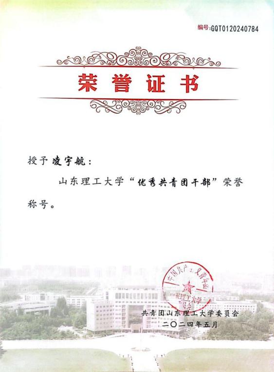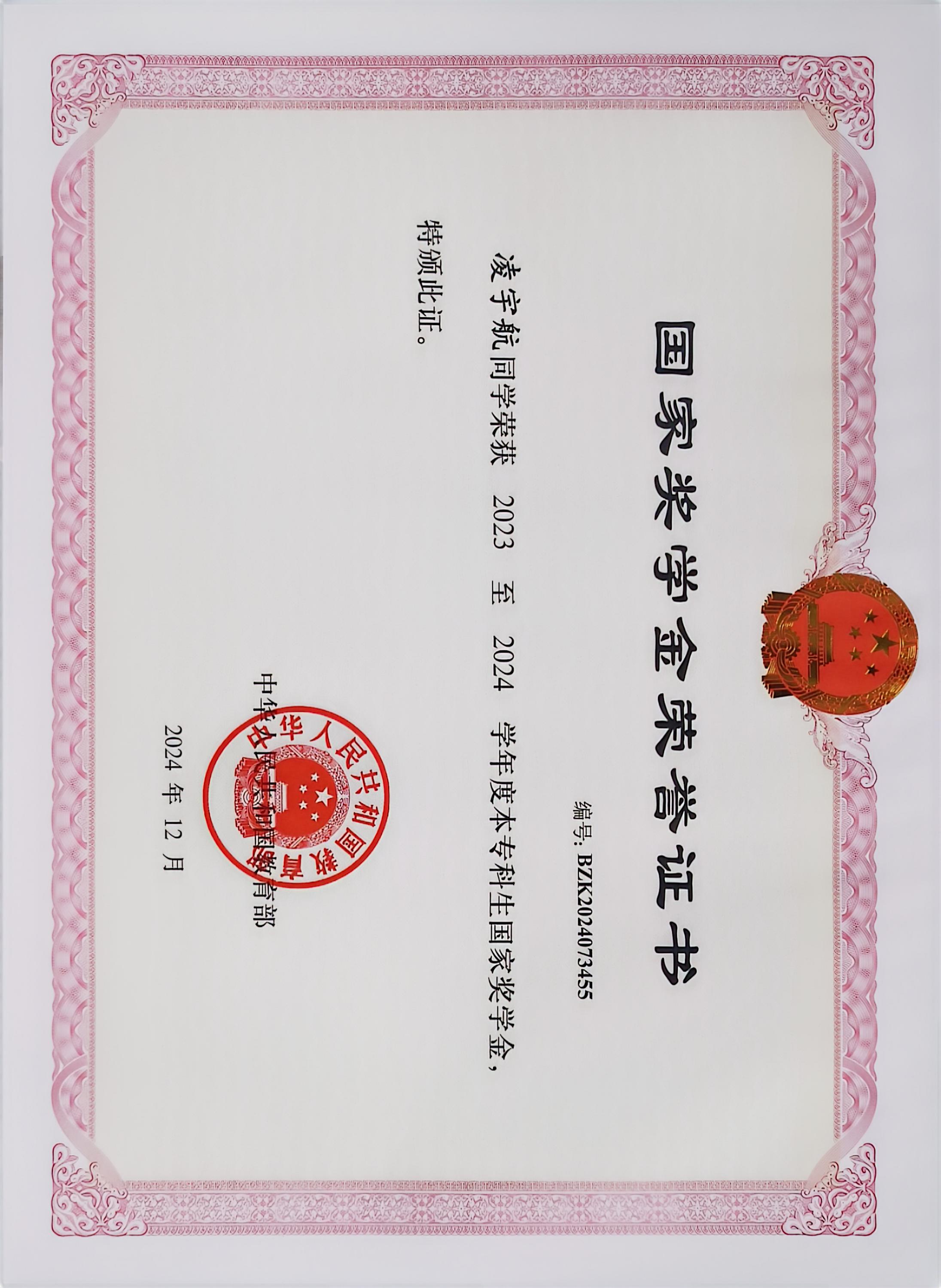 大学期间先后获得校级优秀学生、优秀学生干部、优秀共青团员、优秀共青团干部、科技创新先进个人等荣誉称号13项,获得国家奖学金、校级一等奖学金、学习成绩单项奖学金等奖学金5项。