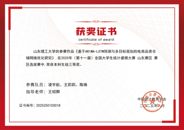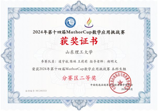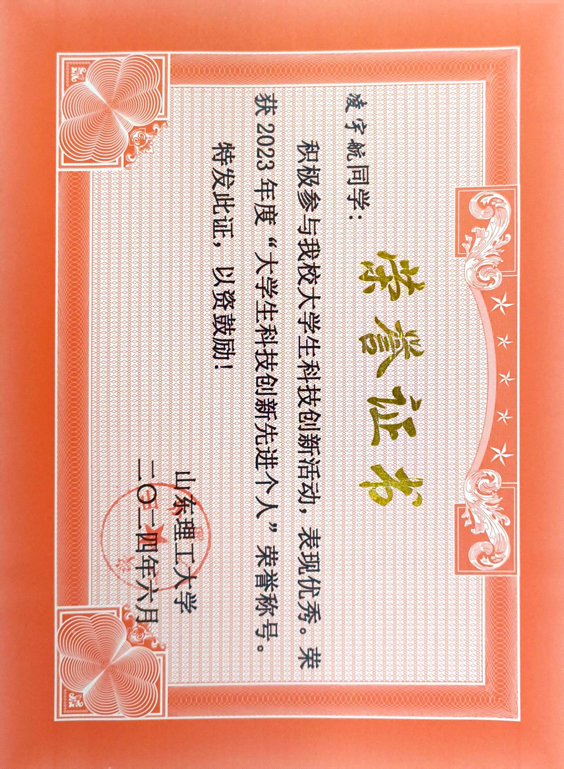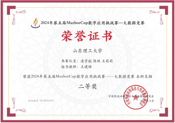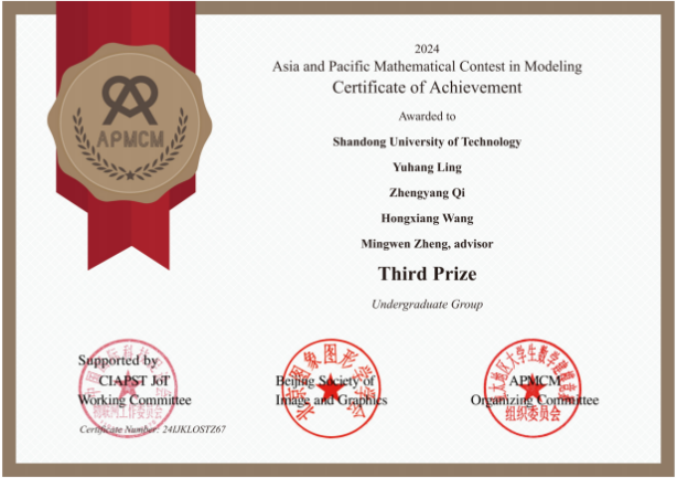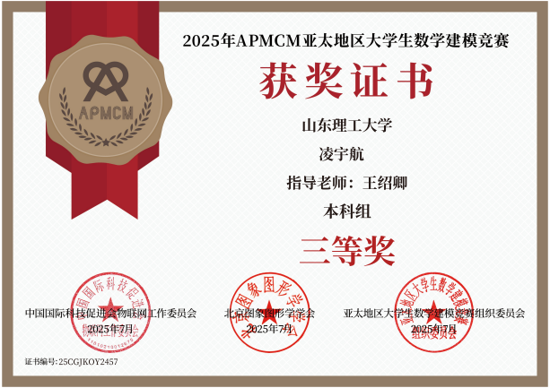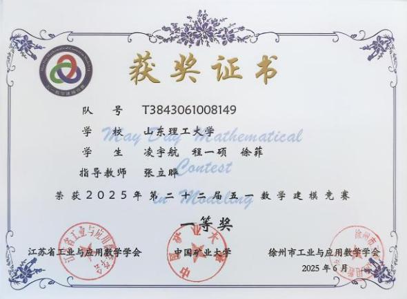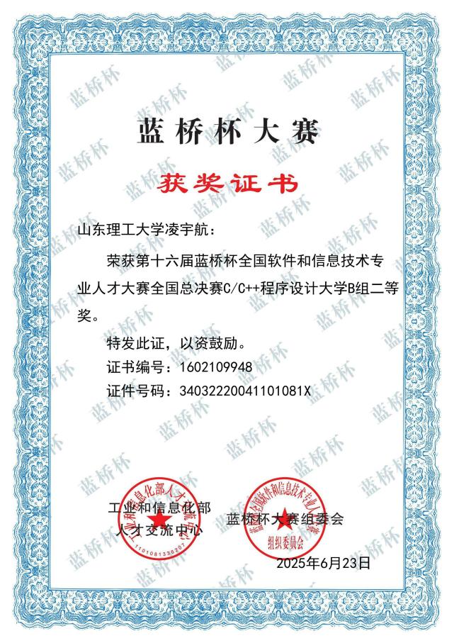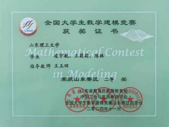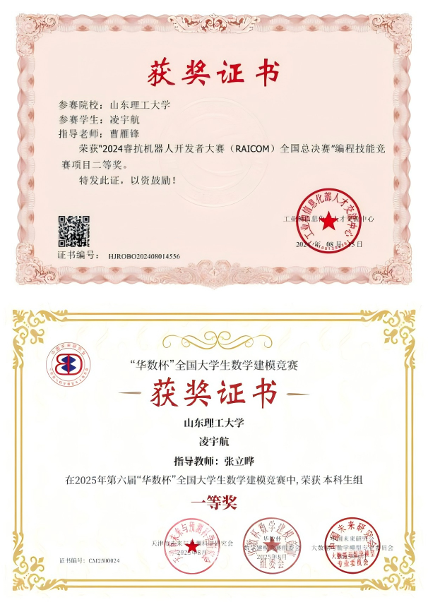 大学期间积极参加各类学科竞赛,获得包含编程算法类、数学建模类、基础学科类、创新创业类等多种奖项,累计获得国家级奖项12项(如蓝桥杯全国二等奖、睿抗机器人开发者大赛(RAICOM)编程技能竞赛全国二等奖、华数杯全国一等奖、五一建模全国一等奖等),省部级奖项10项(如全国大学生数学建模竞赛山东省二等奖、全国大学生统计建模大赛山东省三等奖、MathorCup数学应用挑战赛山东省二等奖等),校级奖项若干。