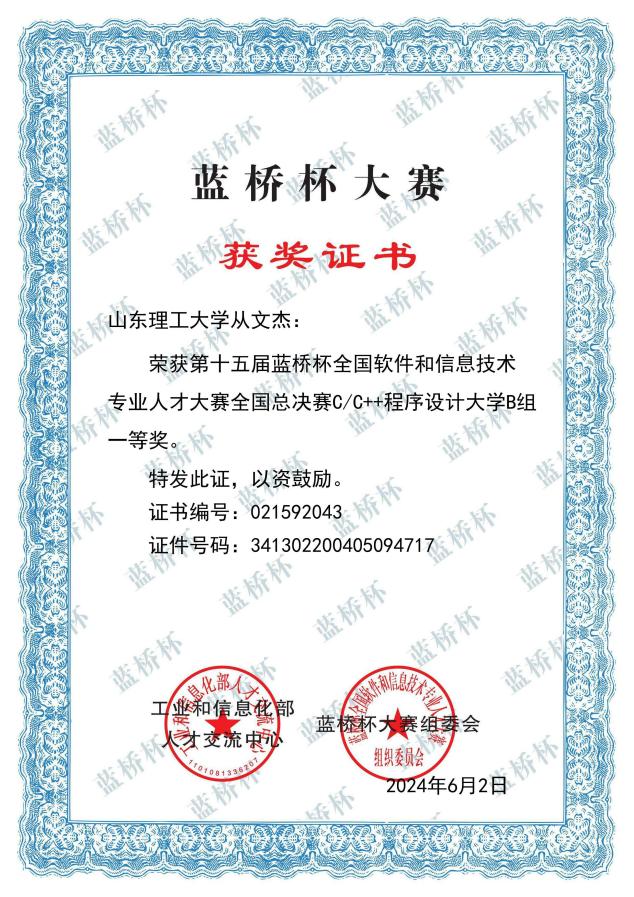 蓝桥杯全国总决赛C/C++程序设计大学B组全国一等奖