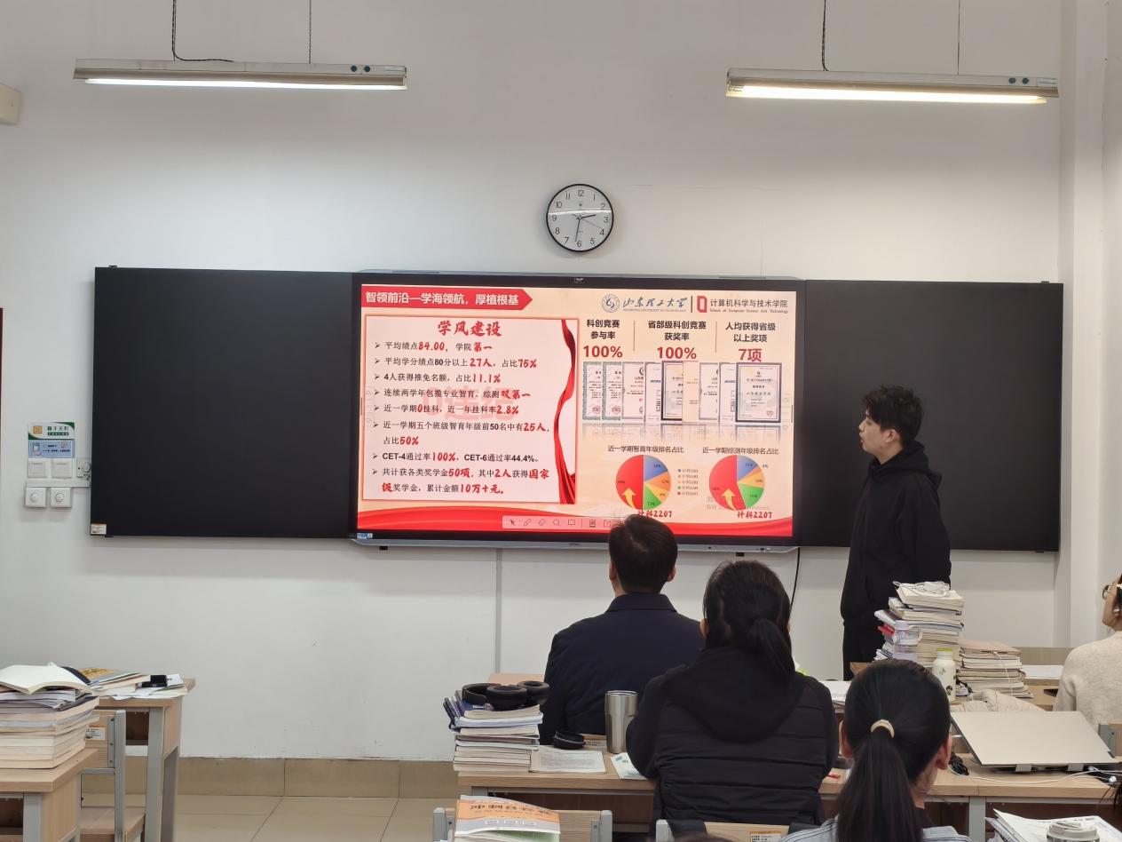 会议伊始,班长刘凯彬对2022级图灵班自成立以来的科技竞赛成绩、科研创新成果以及近三年班级学习成绩做了总体汇报,展示了班级在ACM-ICPC、蓝桥杯等赛事中累计获得国家级奖项90项、省部级奖项191项的优异成绩,以及班级成员在科研项目、软件著作权、专利等方面的丰硕成果,充分体现了图灵班同学在科技创新与实践能力方面的卓然风采。
