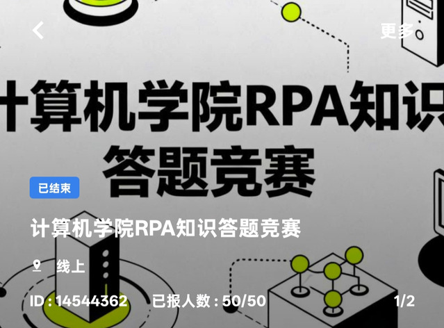 为普及机器人流程自动化(RPA)相关知识,激发学生探索前沿技术的兴趣,检验并提升同学们的 RPA 知识水平,12月5日至6日计算机学院数字机器人协会于近期举办了线上 RPA 知识答题竞赛。本次活动兼顾知识性与趣味性,吸引了众多不同基础的学生踊跃参与。