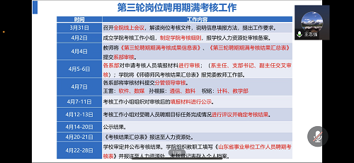 首先,执行院长王志强向全院教职员工传达了学校视频会议讲话精神,并安排部署了学院第三轮岗位聘用期满考核暨2022年专业技术岗位评聘工作。针对学院2022年专业技术岗位评聘工作,王志强院长从评聘依据、组织机构及职责、申报与评聘程序、有关规定等方面向与会人员进行了详细介绍;针对学院第三轮岗位聘用期满考核工作,王志强院长突出强调了考核程序、有关说明与要求。王志强院长表示,考核评聘是今年的一项重要工作,全院教职员工要高度重视,坚持原则,一起携手,为建设国内知名、省内一流的教学研究型信息技术学院而努力奋斗!