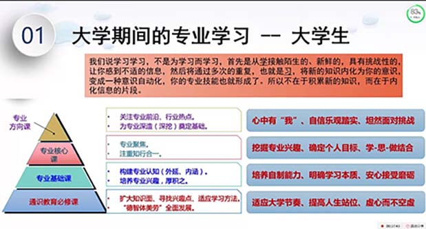 此次线上未来方向座谈会的开展,开拓了学生的眼界,充沛了学生的思想,为学生未来方向的发展提供了思路。会议中对大学课程详细的分析,为早已做好准备的同学丰富了细节,指出大学生不应单单只是学习知识,更要将学习知识的思维内化,才能更好地提升自己的境界。