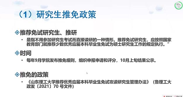 接下来,张冬梅将大一到大四的课程大体归纳为通识教育必修课、专业基础课、专业核心课和专业方向课四个种类,并对四年的课程进行了详细的分析,同时对同学们提出了每个阶段相应的要求,层层递进,为同学们规划了一个“广学而博,专一而精”的专业学习路线。最后,张冬梅讲解关于大学期间的个人提升的问题。她提到“机遇偏爱有准备的头脑”,所以想要获得奖学金和研究生推免资格的同学要做好充分的准备。对于奖学金的申请,要明确申请的条件,丰富自己的经历,分别刨析学习成绩、科创竞赛、任职经历、社会实践四个方面内容;对于研究生推免,她建议同学们要“做早鸟、多取经、务关注、靠自己”。