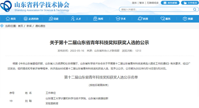 计算机学院刘聪教授荣获第十二届“山东省青年科技奖”